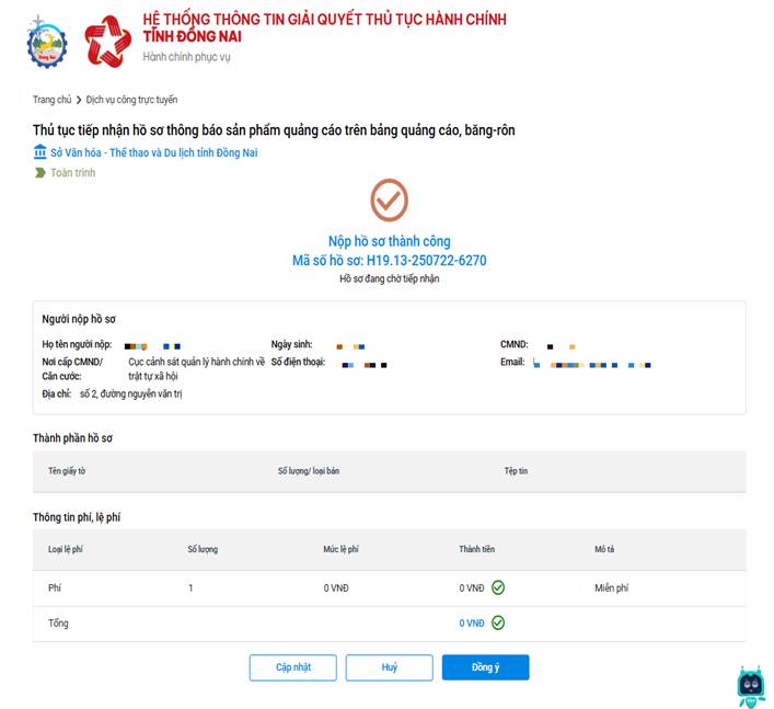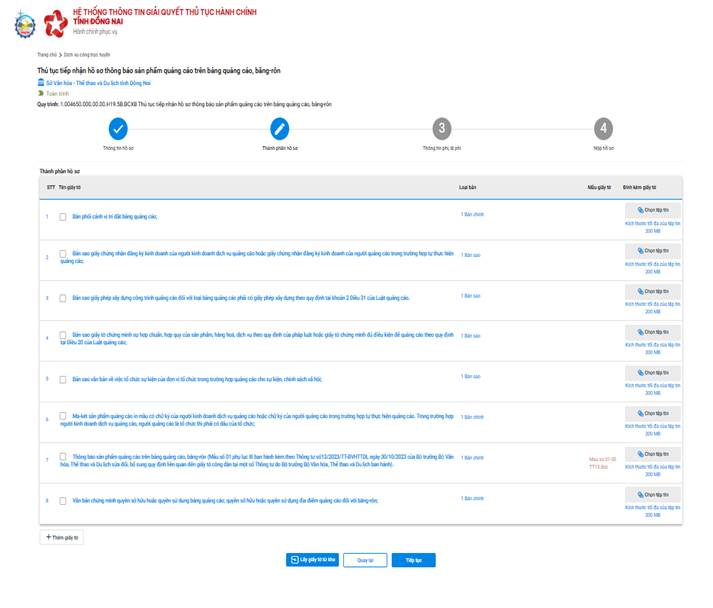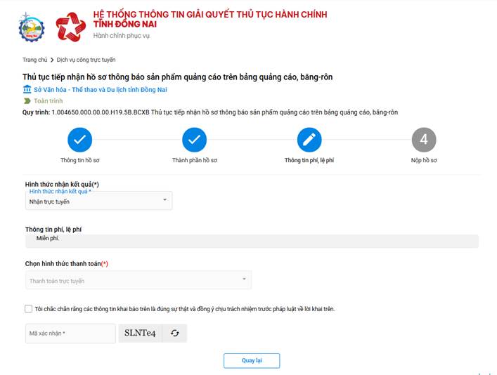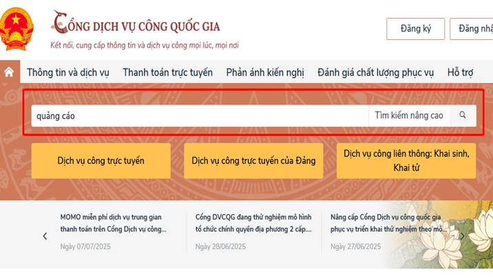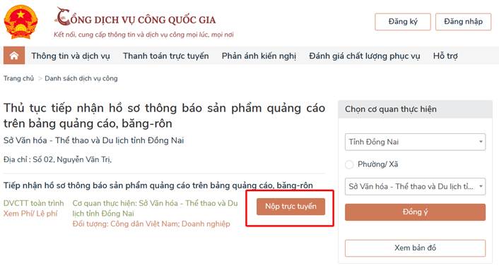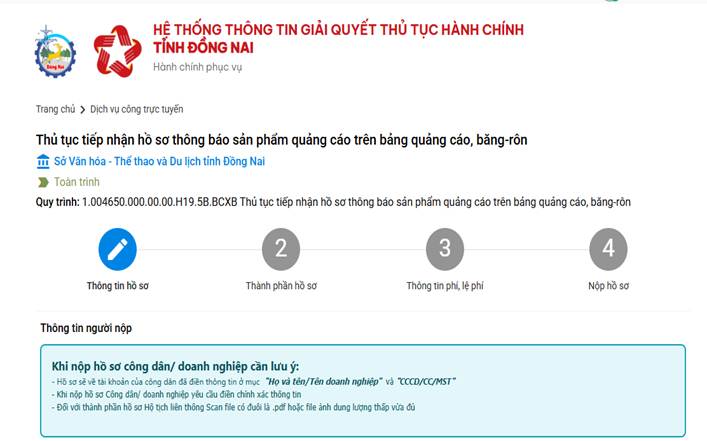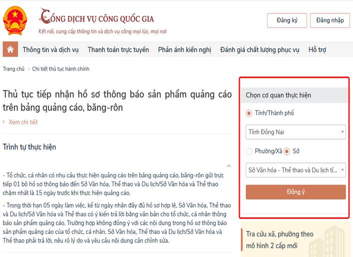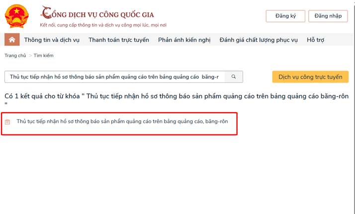 | Bước 6: Bấm “Thủ tục tiếp nhận hồ sơ thông báo sản phẩm quảng cáo trên bảng quảng cáo, băng-rôn” |