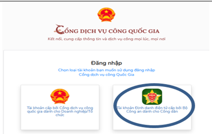 | Bước 3: Bấm Chọn tài khoản định danh điện tử cấp bởi Bộ Công an dành cho Công dân |